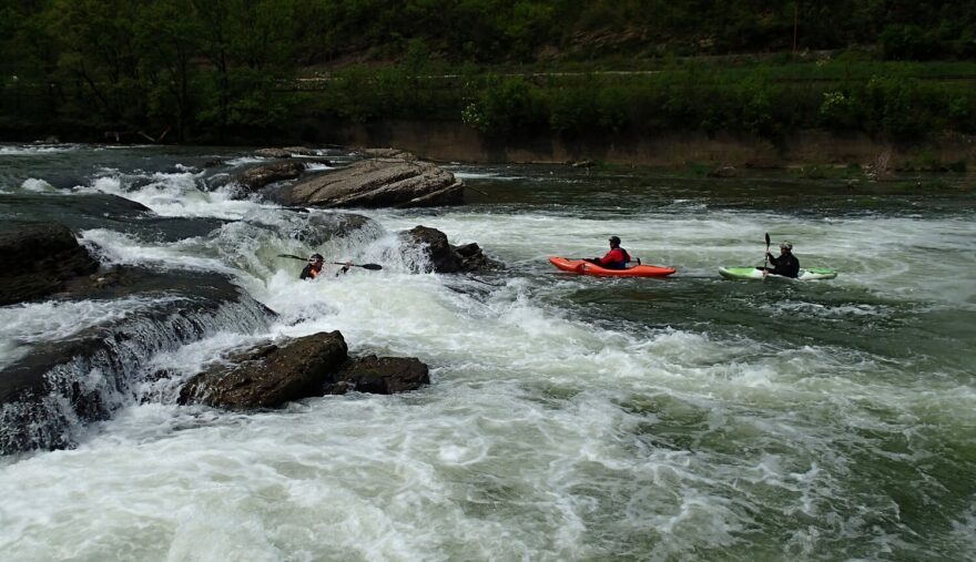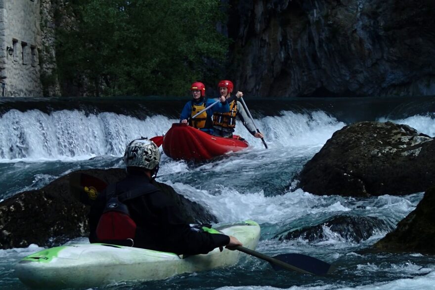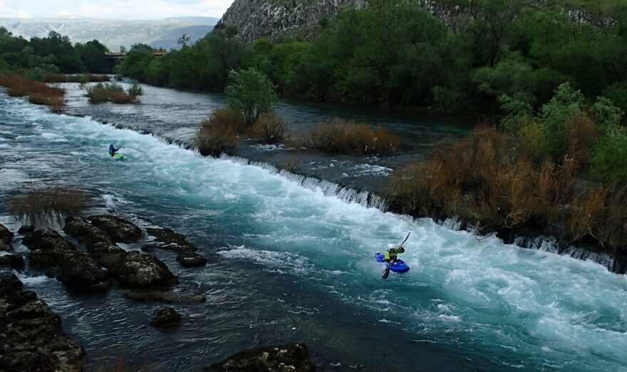 Buna je sice lehká, ale už jen její pramen vyzývá k povinnému splutí. Průzračná ledová voda vytéká z ohromné jeskyně pod vysokou kolmou skálou, pod jejímž převisem se krčí malý klášter. Napravo stánky a půjčovna kánoí, nalevo hospoda, od moře jen kousek. Za 1 den to i s prohlídkou Mostaru stihnete. Nejprve splouváme pár lehkých peřejí, pak se Buna zklidní a několikrát se větví do ramen. Končíme asi po 5 km a rychle přejíždíme nad Mostar k hrázi přehrady na Neretvě. V řece se valí spousta čisté vody a i místa s klidnou hladinou zlobí mocnými karfioly a víry. Plujeme slepencovým kaňonem s jednou velikou peřejí. Nízké betonové pilíře ve vodě nám velí zastavit a následující peřej prohlédnout. V pravé polovině je ohromný válec, rozumný průjezd je vlevo. Asi po 8 km připlouváme do Mostaru, kde potkáváme několik rychlých člunů s turisty. Pod mostem stavíme na sváču a rychlé kafe, jsme středem pozornosti. Pokračujeme dál, kde rychlou plavbu zpestřují občasné peřeje. Míjíme ústí Buny, dál následuje místo zvané Buna Tjesno, za malé vody skalní korýtko s hladkou rychlou vodou, teď je to ohromná přetékající šlajsna s vysokými vlnami uprostřed a víry u břehu.