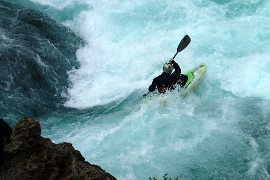 Následující den nás čeká zlatý hřeb programu, Una. V poslední vesnici přepřaháme vlek a přestupujeme do domluvených mikrobusů. Nevěřili byste, co utáhne bosenskej tranďák. Nasedáme na klidnou hladinu asi kilák nad vodopádem, ten přenášíme vpravo. Nasedám pod nejvyšším stupněm, který dva borci jedou proudnicí skoro zadara. Vody je hodně, má tah, je průzračná, zelenomodrá. První 3 km jsou náročné, proudící voda je prokládaná těžkými peřejemi s velkými zabaláky, karfioly a víry. Pak se zleva vlévá řeka Kratnica vytékající z hromady balvanů, no, nedá mi to, abych si ji nevynesl a jejích 7 metrů nesplul. Dál je Una výrazně lehčí, na závěr splouváme tři krasové stupně, ten první vpravo, uprostřed je nebezpečný sifon! Čeká nás opět dlouhý přejezd, tentokrát na Neretvu.