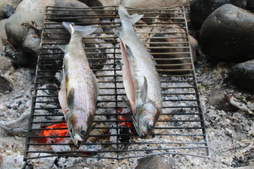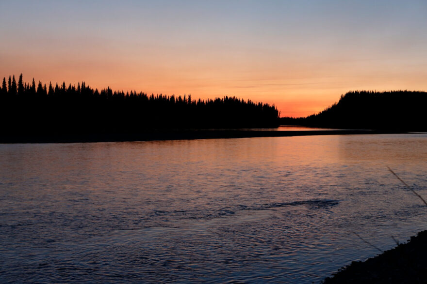 Táboření bylo po celé cestě přepychové. Mohli jsme si vybrat mezi stínem lesa a měkkým, voňavým mechem a slunečným místem na širokém břehu s vyhřátými, jemnými oblázky. Přímo z řeky nám byla k dispozici čistá voda i suché naplavené dřevo, které pro nás pracovití bobři připravili tak, aby se dalo přiložit rovnou na oheň. Večery a rána byly nadprůměrně teplé. Během dne vládly teploty nad 20°C ve stínu, na slunci pak bylo často až nepříjemně horko. Mlhu jsme zažili jen jedno ráno. Nepříjemný kouř z lesního požáru, který kdesi, snad sto kilometrů daleko, vypukl, nás obtěžoval naštěstí jen jedno odpoledne a večer. Ptáci utichli a pach spáleniště visel nad krajem. Z nebe se k zemi lehce snášel bílý popílek a nebýt úmorného vedra, dalo by se uvěřit, že sněží. Slunce se topilo v kouři a zvláštní smutná nálada se rozprostřela nad krajem. V noci se směr větru naštěstí obrátil a ráno už nebylo po kouři a padajícím popílku ani památky.