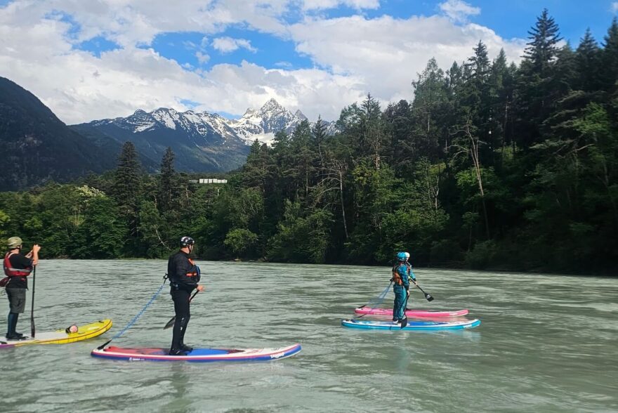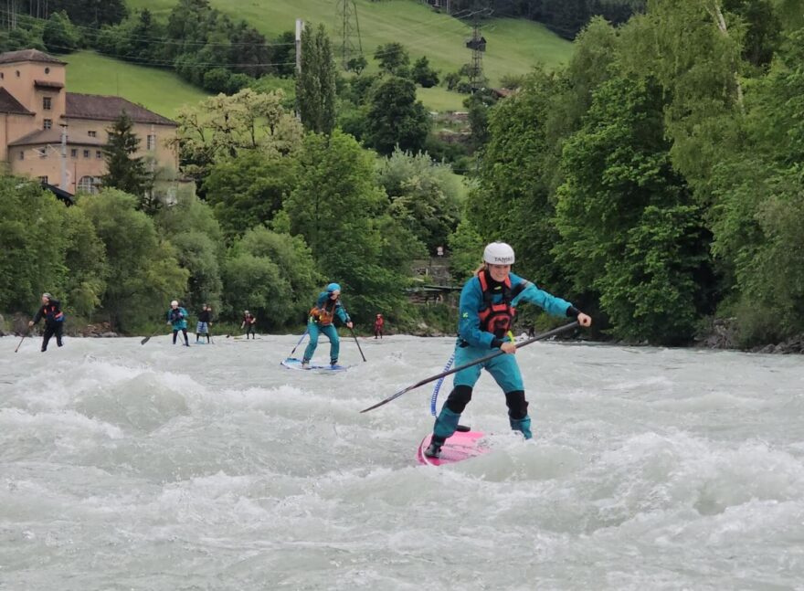 V sobotu jsme spluli prakticky v kompletním složení SUP pádlerů úsek ze Scharnitzu do kempu. Odpoledne jsme se, trochu proti plánu hlavní organizátorky, vydali na náš oblíbený Imsterslucht na Innu. Na Isar se nám znovu nechtělo a Inn měl parádních 300 kubíků. Přidali se k nám i placené hvězdy celého setkání Sam a Cameron ze Skotska, kteří sice měli inspirovat ostatní SUP jezdce k vyšším výkonům, ale nakonec se domluvili se svojí donátorkou, že si pojedou s námi zkusit pořádnou vodnatku. Větší řeku ještě prý nejeli a i nás Inn mile překvapil. Za tohoto vodního stavu se jedná o krásnou, silnou řeku s mnoha vlnami, ale bez záludných a nebezpečných míst. Unaveni jsme se na večer vrátili do kempu na menší večírek a promítání skotského filmu o pádlování v jejich domovině a našeho filmu z Tary.