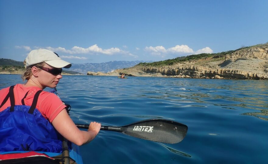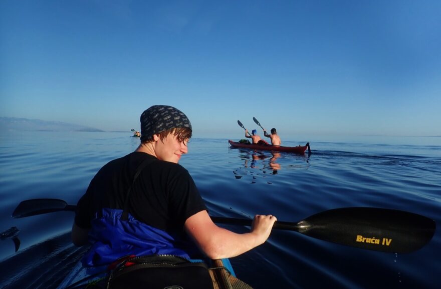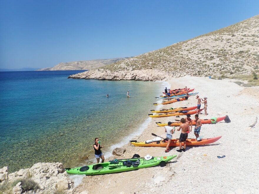 Dneska už je předpověď trochu horší, postupně se má přidávat vítr. Vyrážíme co nejdřív a moře dost houpe. Jedeme podél menších ostrůvků zpátky ke Krku až do městečka Baška. Cestou děláme super zastávku na jednom z ostrůvků, kde je pláž s molem pro lodě, pod kterým je dost hloubky na skákání. Postupně si půjčujeme šnorchl a brýle. Pod vodou je tady spousta mušlí, ježků a dalších zajímavých věcí. V Bašce děláme přestávku na zmrzlinu a vyrážíme dál. Cíl je zátoka Vela Luka. Po cestě k ní ale vítr zesiluje a vlny jsou hodně velké. Sice všichni umí na kajaku dobře a dost lidí i eskymáka, ale stejně moc v klidu nejsem. Zatímco já přemýšlím, jak to bude pěkně na pytel, až se někdo cvakne, mladší členové posádky si zpívají. Berou to jako velké dobrodružství. Nejradši bych je zaškrtil, ale nakonec si říkám, že dobrá nálada je v tuhle chvíli důležitá. V pravý čas připlouváme do zátoky. Jiný svět, po vlnách ani památka.