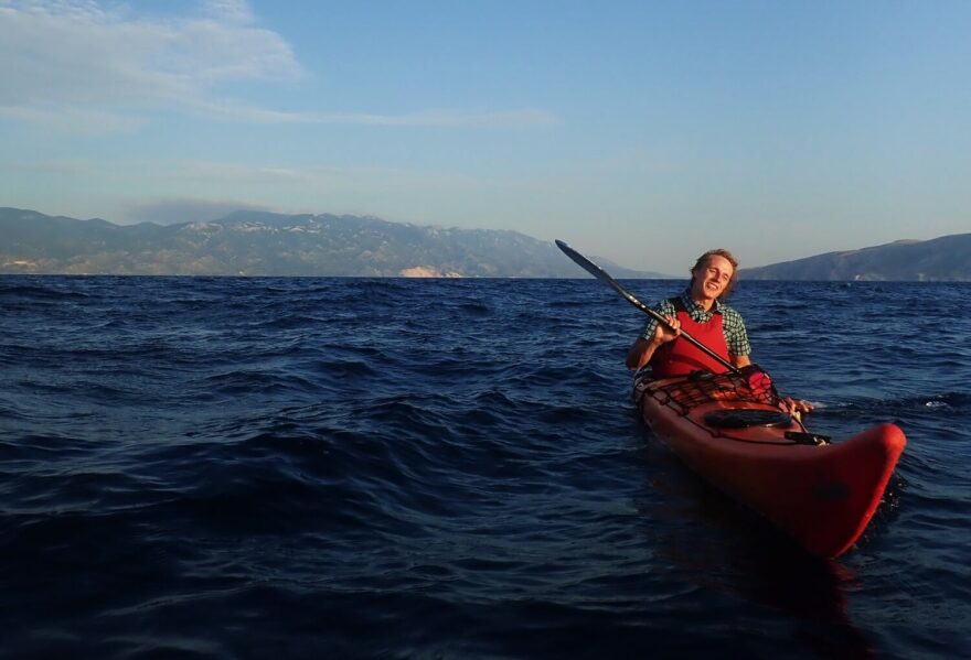 Vyplouváme po západním pobřeží. Pro hodně z nás je to poprvé na moři. Zkoušíme kajaky, kormidla, děláme časté zastávky na opuštěných plážích nebo ve vesnicích po cestě. Přesný plán nemáme, jen orientačně víme, kolik musíme za den ujet. Po asi 22 km jsme našli krásné místo za vesnicí Porat. Večer nám zpříjemňuje hraní na kytaru, kterou vezeme v nepromokavém obalu s sebou.