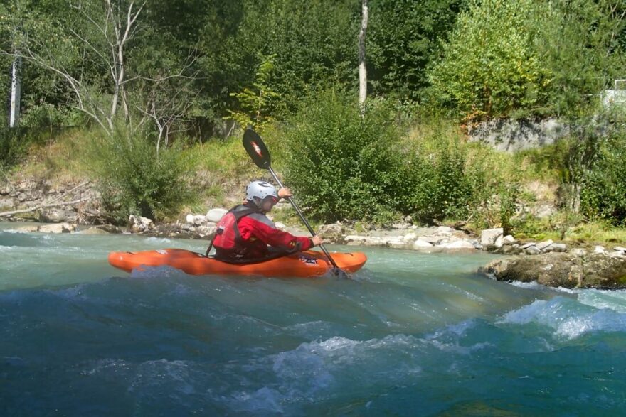 Připlouváme do Schladmingu. Asi uprostřed města je balvanitý stupeň, který zprava obhlédneme a postupně splouváme u levého břehu, kde se zdá dobrá lajna. I tak škrtnu o balvan na konci jazyka. Pod městem je Enže znatelně lehčí, plavbu zpestřují výrazné vracáky za hatěmi u břehu, ale už jen občasná peřejka. Končíme po 20 km vpravo pod železničním a silničním mostem u Rupertingu.
