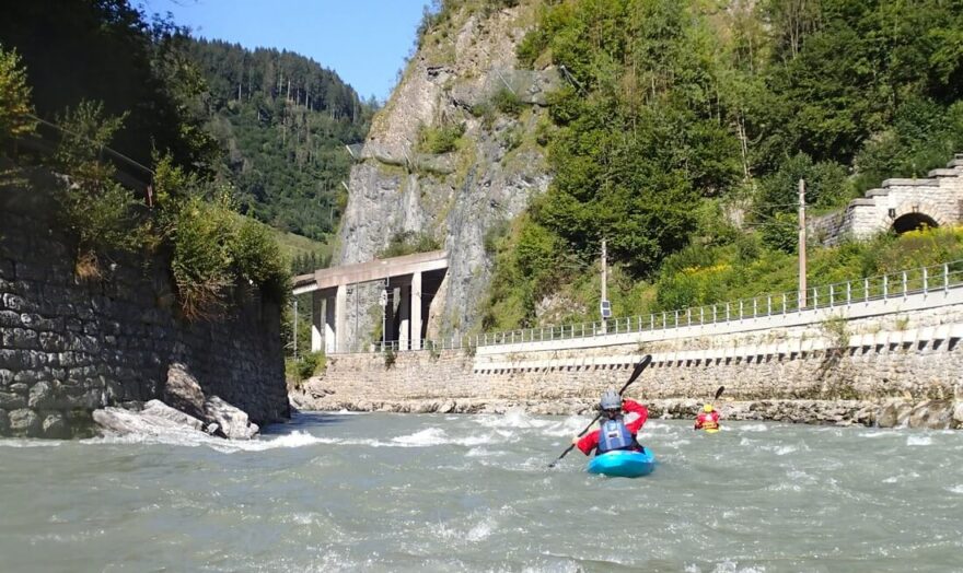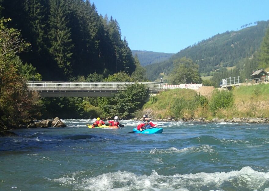 Další pěkná peřej nás čeká hned za mostem u železničního tunelu v Kendlbrucku. Asi stometrové esíčko s velkými vlnami a válečky. Počasí nám přeje, slunce na blankytně modré obloze bez jediného mráčku příjemně hřeje, a tak si bezstarostnou plavbu pěkně užíváme. Chvilku po poledni ještě trochu potrénujeme na slalomce pod Sankt Ruprechtem, ale hned pod ní končíme u mostu, u kterého máme auto.
