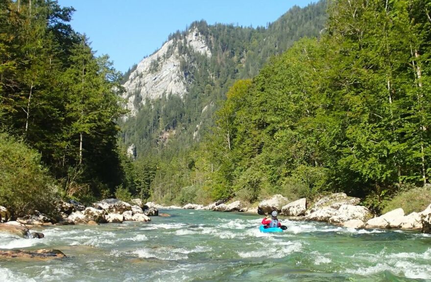 Vzájemně a se škodolibým potěšením se strašíme peřejí za zatáčkou, ale nečeká nás tam nic těžkého, jen pár metrových vln v zatáčce pod hradem a pak v dlouhé peřeji za silničním mostem. To už vyhlížíme konec plavby, který nechceme přejet, po dvou kilometrech řeka mizí v rokli Salzachöffen, a tu rozhodně jet nechceme.