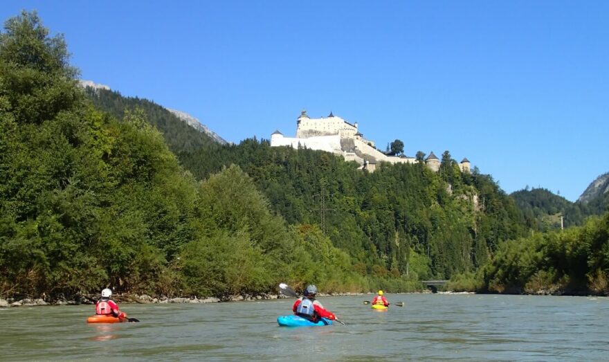 Ráno přejíždíme na Salzach. Na první úsek nasedáme na levém břehu přímo pod elektrárnou Werfen. Řeka je zde široká okolo 60 metrů, a tak průtok 200 kubíků není velká voda. Počasí je jak přes kopírák, ostatně vydrží nám takhle až do neděle. Kocháme se výhledem na impozantní hrad Hohenwerfen stojící na strmé skále na levém břehu. Tady jsem ještě nepádloval.