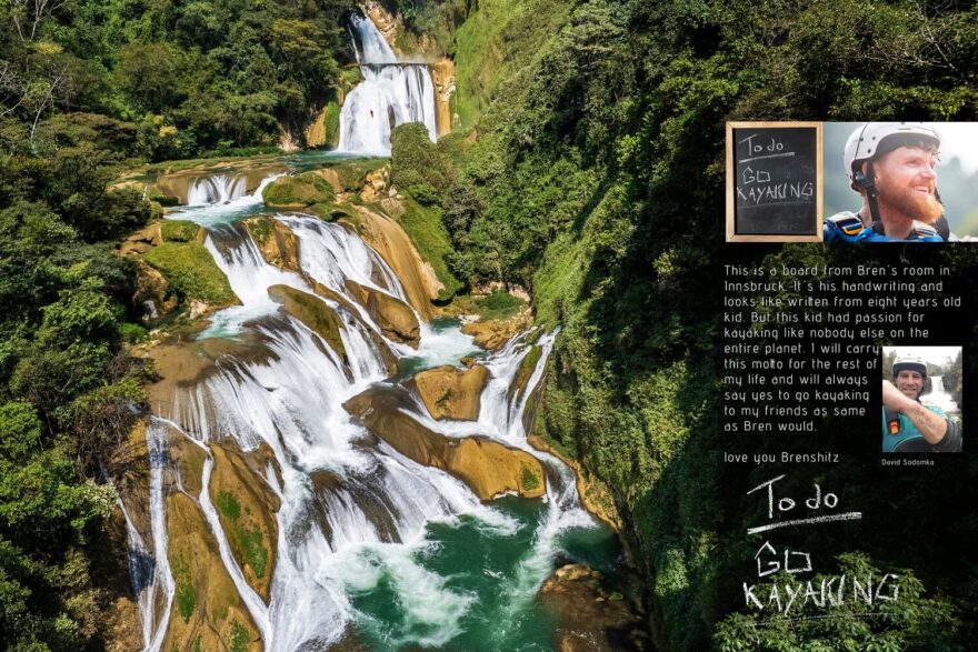 Bren byl pro mě nesmírně důležitý člověk. Nejen, že byl famózní kajakář, ale i inspirativní osoba v mnoha ohledech. Já jsem po té tragédii cítil, že potřebuju nějaký talisman, nějaký odkaz na Brena, který budu mít vždy u sebe. Když jsem po nehodě přijel do Innsbrucku, Adrian Mattern mě vyzvednul na nádraží a cestou domů říkal, že se následující den zastaví Marcelo – Brazilec, který Brenovi tetoval jeho největší tetování. Marcelo je taky kajakář. Následující den přijel, přirozeně jsme se dali do řeči a jelikož jsem poslední zimu strávil hodně času v Brazílii, měli jsme si dost o čem povídat. Důvod, proč přijel, byl, že nabídnul komukoliv udělat tetování na Brenovu památku. Já, který jsem byl v tomto ohledu nepopsaný list, jsem začal přemýšlet, zdali bych si nenechal taky něco vytetovat. Seděl jsem v pokoji, kde Bren bydlel a koukám na malou tabulku nad stolem, kde stojí: „TO DO, GO KAYAKING“. Jednoduché heslo, ale přesně to, čím se Bren řídil, navíc to byl jeho rukopis. Zkrátka něco, s čím se naprosto ztotožňuji. Hodinu na to už mi přesně tohle heslo Marcelo v jeho obytňáku tetuje na předloktí. Popíjím gin s tonikem, vzpomínáme společně s Adrianem na Brena a jak by byl nadšený, že se nechávám tetovat. Toto je můj talisman.