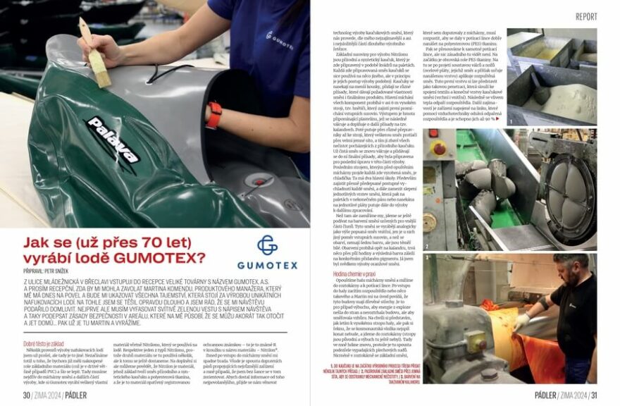 Třeba velká reportáž popisující, jak se vyrábějí lodě GUMOTEX a to včetně výroby unikátního materiálu Nitrilon. Nebo popis závodu Spree-Marathon, který na podzim loňského roku absolvovali Jiří „Choroš“ Hron s parťákem Pašíkem a i několik dalších zástupců z Česka. A opět se nám taky rozepsal Zbyněk Pulec, který se ještě podrobněji zabývá historií Čertovky a vodního slalomu na jejích vodách.