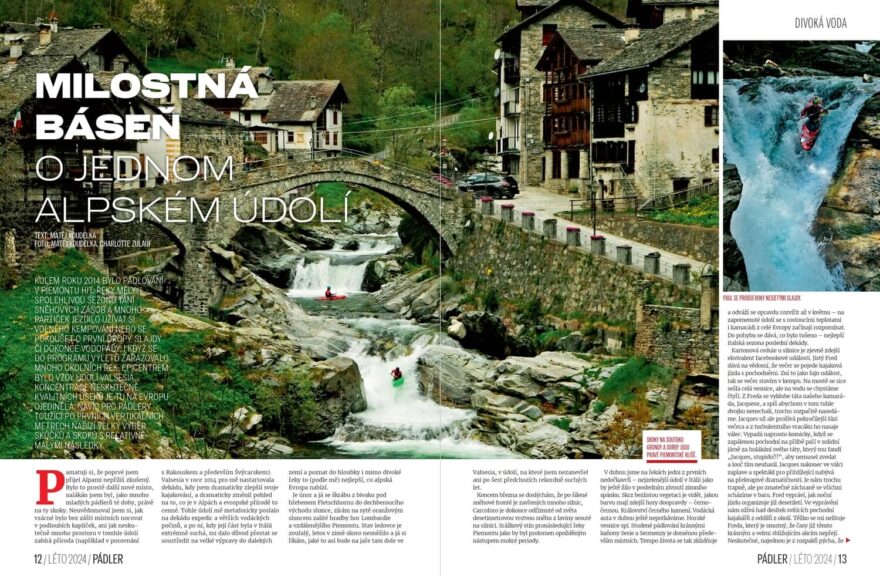 O jeden z nich se postaral Matěj Koudelka, který nevynechal jarní pobyt v oblasti Valsesia ani jednou za posledních deset let a tohle legendární místo mu očividně přirostlo k srdci. Letos se v tomto vyhlášeném údolí extra vyvedly podmínky a sezona začal brzy na jaře a trvá snad dodnes. Matěj popisuje nejen klasické řeky, ale také perličky, které tu jel jen málokdo. A k tomu pohodový každodenní život v údolí plynoucí italským tempem.