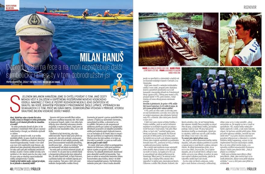 Třetí rozhovor připravila Eliška „Šišule“ Ebelová a vyzpovídala v něm vedoucího vodních skautů z Hradce Králové Milana „Jelena“ Hanuše. Řeč byla nejen o jelenových začátcích s vodou a jeho skautování, ale také o zakládání nového oddílu a radostech i starostech, které to přináší.