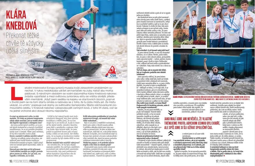 Rozhovory jsou v časopisu tentokrát tři. Ten první připravila Anička Hrbáčková a vyzpovídala v něm naši juniorskou vodní slalomářku Kláru Kneblovou, která v letošní sezoně dokázala to, co ještě nikdo před ní. Ze všech startů na Mistrovství světa v Krakově brala medaili a k tomu byly tři z těch medailí zlaté. Úsloví „medailové žně“ tak Klára posunula na nový level a světu ukázala, kdo je ve vodním slalomu absolutní velmocí.