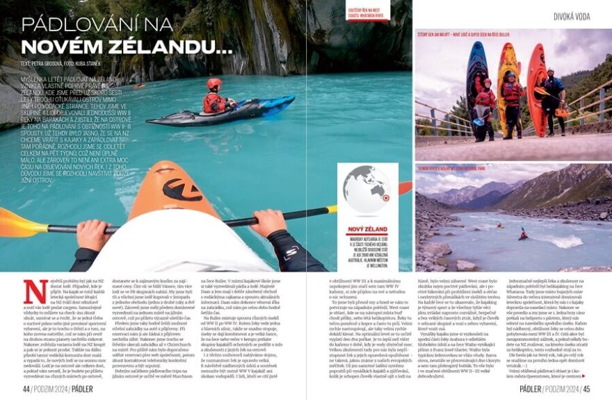 Dále nás na druhý konec světa berou Petra Grosová (ta napsala text) a Kuba Staněk (ten dodal parádní fotky), kteří byli v zimě pádlovat na Novém Zélandu. Nepohybovali se však na pětkových „sifonádách“, kterými je Nový Zéland známý a někdy to z naší perspektivy dokonce vypadá, že tam snad ani jiné řeky nejsou. Jsou, jsou krásné, a právě o nich je článek. Znamená to jediné – pádlování na „ostrovech“ je i pro obyčejné smrtelníky.