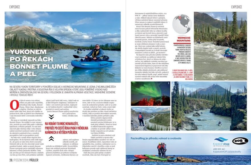 Stálicí české vodácké scény je Robert Kazík, který pro nás taky občas něco sepíše a vždy to stojí za to. Tentokrát nám Robert popsal svoje putování s partou kamarádů po méně známých řekách v Kanadě, konkrétně v Yukonském teritoriu. Při čtení popisu řek Bonnet Plume a Peel, které protékají pohořím Wernecke Mountains, budete chtít hned vyrazit taky. Prostě nefalšovaný vodácký čundr. Následuje rubrika AVTS, ve které se Míla Pražák vrací k zářijovým povodním a zejména k „honům“ na vodáky, které probíhaly napříč republikou. Opravdu zajímavé zamyšlení.