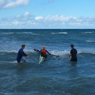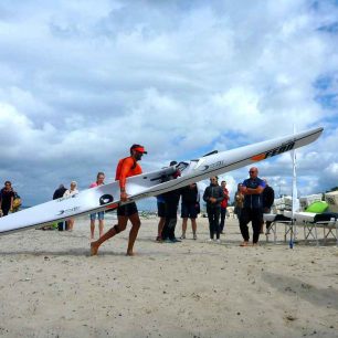 Cílovou pláž už mám na dohled, stáčím se k ní, osedlávám si poslední vlnku svého závodu a po ní surfuji až ke břehu. Těsně před pláží mě kluci v neoprenu chytají a zavěšením za špici zbrzdí mou rozjetou loď. Vyskakuji na mělčinu a běžím fandící uličkou k cílové metě.