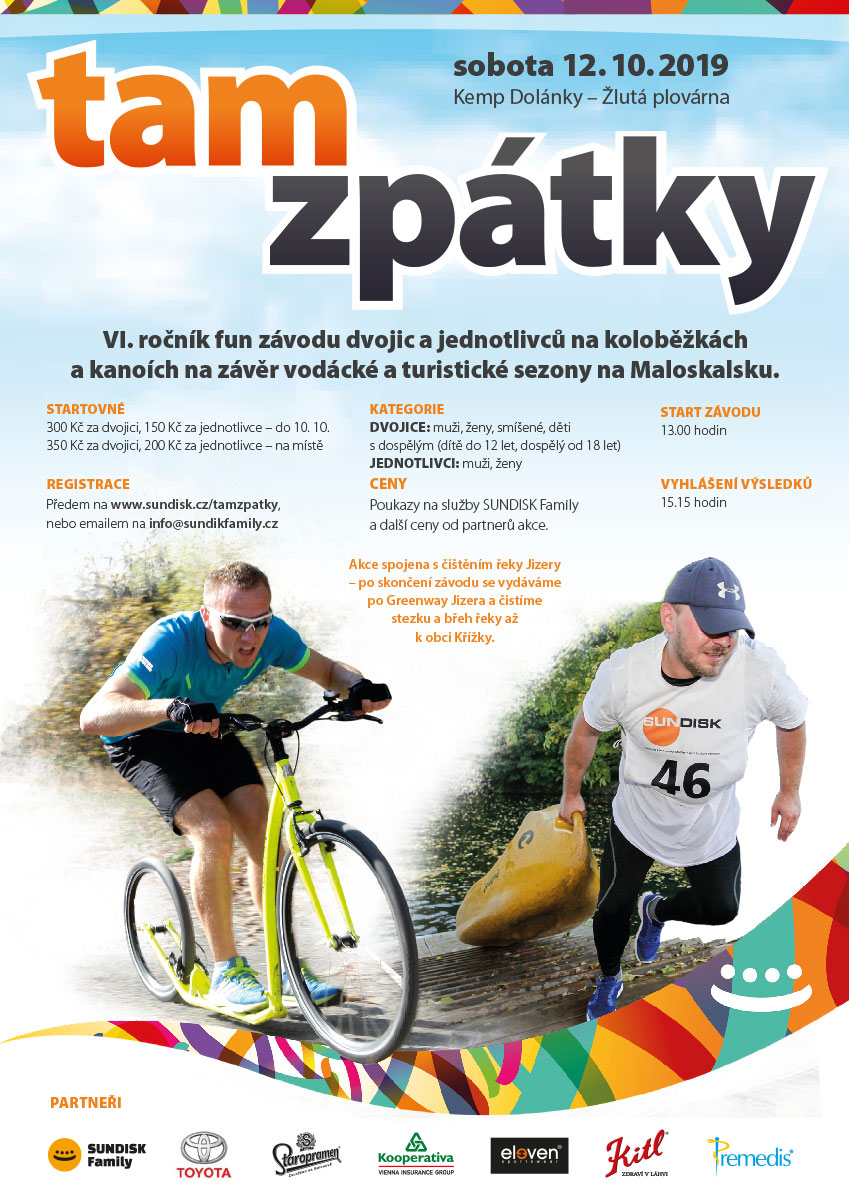 SUNDISK s.r.o. srdečně všechny zve na 6. ročník zábavného závodu nazvaného Tamzpátky, který se uskuteční v sobotu 12. 10. Jedná se o závod dvojic na koloběžkách a kánoích nebo jednotlivců na koloběžkách a kajaku či paddleboardu. Zároveň je akce ukončením vodácké a turistické sezony na Maloskalsku a účastníci závodu i diváci po dojezdu všech závodníků čistí cysklostezku a břeh řeky Jizery v úseku Malá skála – Křížky. Podrobnosti hledejte na webu pořadatele nebo na plakátu.