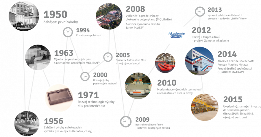 Důležité milníky v historii firmy GUMOTEX1956: Zahájení výroby nafukovacích produktů 1972: Rozšíření výroby nafukovacích výrobků, přesun do nových, větších prostor 1999: Rozvoj výroby polyuretanu a programu nafukovacích výrobků |