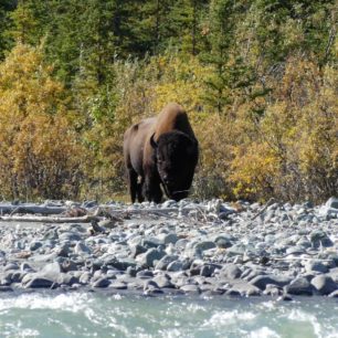 Na vodu poprvé sedáme na řece Jarvis, což byl bezva tip od místního guida Kevina. Jarvis je čisťounká řeka, to máme rádi. Po jednom dni romantické plavby lesem náhle Jarvis přejede práh do údolí Alseku a rozjede se jak dráha. Jenom řídíš a koukáš, jak to maže z kopce. V tom fofru zahlédnu prapodivnou skálu na břehu řeky. Když přijedeme blíž, ukáže se, že to není skalka, ale bizon. Hromada hovězího na nás v klidu kouká a my se radši zdržujeme u druhýho břehu, protože je opravdu velký.