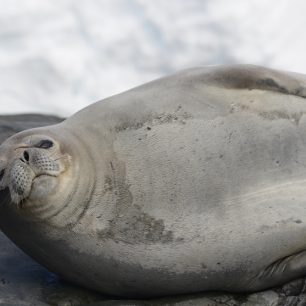 Pokračujeme dál podél břehů, z nichž se zvedají vysoké černé skály, pokryté směsí sněhu a ledu. Na jedné z ker zpozorujeme ležícího tuleně leopardího. Obrovský ploutvonožec patří mezi hlavní predátory antarktických vod. Nás si ale ani nevšimne a klidně nás nechá připlout na pár metrů. Chladný Jižní oceán je bohatý na živiny, a proto tu najdeme také největší mořské savce – velryby. Tisíce kytovců se sem stahují na krátké antarktické léto, aby hodovaly na hojnosti krilu a dalších mořských „dobrotách“. Velrybí ploutve pozorujeme z kajaků několikrát ve velké vzdálenosti, pádlujeme přeci jenom poměrně blízko břehu.