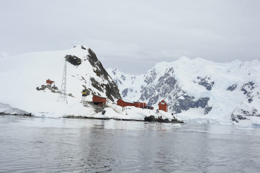 I když – jedna známka lidského života se právě rýsuje přímo před mojí přídí. Jsou to oranžové boudy opuštěné argentinské základny Base Brown. Polárníci tu nejsou, a tak si jejich domovy přivlastnily desítky tučňáků oslích, kteří v těsném sousedství vybudovali svoji hnízdní kolonii. Kolem opuštěné základny pokračujeme dál pod nedaleký majestátní útes zvedající se do pořádné výšky. Kusy ledu občas ťuknou do špiček našich lodí a my zakláníme hlavu, abychom mohli obdivovat barevnou paletu skal i hnízdiště kormoránů antarktických, kteří se krčí na neuvěřitelně nepřístupných a strmých skalách.