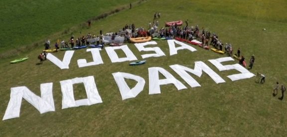 Zlatám hřebem našeho putování byla albánská perla Vjosa, na kterou jsme dorazili přesně rok po natočení filmu. Celý týden byl náš program doprovázen festivalem na soutoku s řekou Drinos kousek nad Tepelene. Setkání s místními, vášnivá vyprávění příběhů u ohně, živá muzika. Náš základní tábor byl místem pravé zábavy a sjíždělo se sem každým dnem víc a víc lidí z rozličných zemí a kontinentů, kajakářů, sportovců a vůbec milovníků přírody. Poslední den celé akce řeku Vjosu pestře zbarvila obrovská flotila téměř padesáti plavidel, která se vydala na 46 km dlouhou plavbu po největší modré tepně Balkánu. V raftu se k nám připojil i viceprezident Evropského parlamentu Ulrike Lunachek, všichni společně jsme propluli monstrózní rozestavěnou přehradou a zažili na vlastní kůži tíseň masy betonu. Ve chvíli, kdy jsme dodriftovali na soutok, čekal na nás dav sto dvaceti nadšených místních a velké emoce byly zpátky. Zbývalo už jen udělat poslední věc.