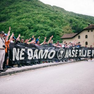 Po náročných dnech pádlovaní jsme byli utahaní jako koťata, ale úžasná energie všech zúčastněných (a domácí balkánská „rakija“) nás nabíjela pro další akci. Když jsme přijeli do Bosny, čekalo na nás přivítání v podobě zapálených lokálních obyvatel, kteří přišli na začátek protestní akce k prameni řeky Sany, jež vyvěrá ze čtyř hlubokých jeskyní. Sana je mixem obtížností WW II-IV, můžete po vodě projet tajemnou jeskyní nebo zdolat malý kaňon s perfektními „drop pool“ vodopády. Rakouská hydroenergetická firma Kelag se prezentuje jako opravdový přítel životního prostředí, a tak jsme její slogany použili na snímcích z dronu, který zachycuje, jak v jednom místě zúžili nádhernou Sanu do sedm metrů široké trubky vedoucí do malé a neproduktivní hydroelektrárny.