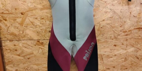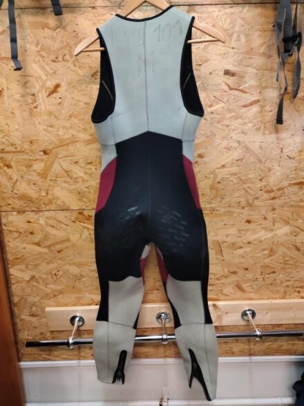 Neopren 5 mm, obousměrný přední zip, zpevněná stehna, kolena a zadek – ten s protiskluzovým potiskem, snadno se obléká díky zipům na kotnících. Na lopatkách fixou napsaná velikost.