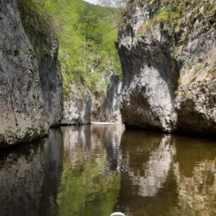 Další den chceme šoupnout řeku Sanica. Jen co vytáhneme z vleku první lodě, je u nás rybářská stráž a opět nás nechce na řeku pustit. Po chvíli přemlouvání a konzultaci se šéfem na telefonu vyměkne a my můžeme pádlovat. Voda je opět čistá, hladina klidná a po chvíli vplouváme do krátkého kaňonu s lehkými peřejemi. Pak následuje kaňon o poznání delší, pod kterým se údolí otevře a na klidném úseku zdoláváme 2 skalní stupně. Po necelých 12 km končíme a přesouváme se na Dabar.