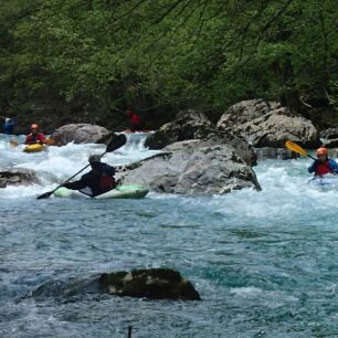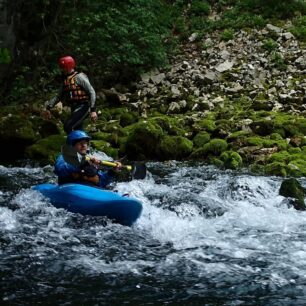 Následující den nás čeká zlatý hřeb programu, Una. V poslední vesnici přepřaháme vlek a přestupujeme do domluvených mikrobusů. Nevěřili byste, co utáhne bosenskej tranďák. Nasedáme na klidnou hladinu asi kilák nad vodopádem, ten přenášíme vpravo. Nasedám pod nejvyšším stupněm, který dva borci jedou proudnicí skoro zadara. Vody je hodně, má tah, je průzračná, zelenomodrá. První 3 km jsou náročné, proudící voda je prokládaná těžkými peřejemi s velkými zabaláky, karfioly a víry. Pak se zleva vlévá řeka Kratnica vytékající z hromady balvanů, no, nedá mi to, abych si ji nevynesl a jejích 7 metrů nesplul. Dál je Una výrazně lehčí, na závěr splouváme tři krasové stupně, ten první vpravo, uprostřed je nebezpečný sifon! Čeká nás opět dlouhý přejezd, tentokrát na Neretvu.