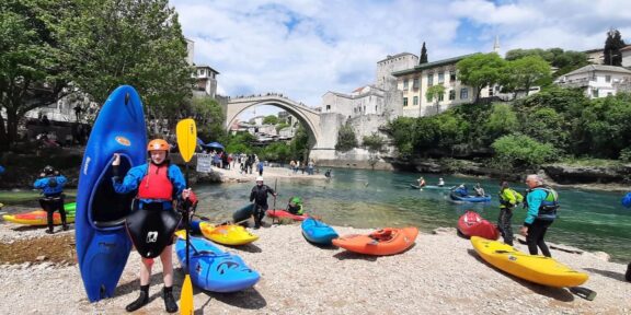 Buna je sice lehká, ale už jen její pramen vyzývá k povinnému splutí. Průzračná ledová voda vytéká z ohromné jeskyně pod vysokou kolmou skálou, pod jejímž převisem se krčí malý klášter. Napravo stánky a půjčovna kánoí, nalevo hospoda, od moře jen kousek. Za 1 den to i s prohlídkou Mostaru stihnete. Nejprve splouváme pár lehkých peřejí, pak se Buna zklidní a několikrát se větví do ramen. Končíme asi po 5 km a rychle přejíždíme nad Mostar k hrázi přehrady na Neretvě. V řece se valí spousta čisté vody a i místa s klidnou hladinou zlobí mocnými karfioly a víry. Plujeme slepencovým kaňonem s jednou velikou peřejí. Nízké betonové pilíře ve vodě nám velí zastavit a následující peřej prohlédnout. V pravé polovině je ohromný válec, rozumný průjezd je vlevo. Asi po 8 km připlouváme do Mostaru, kde potkáváme několik rychlých člunů s turisty. Pod mostem stavíme na sváču a rychlé kafe, jsme středem pozornosti. Pokračujeme dál, kde rychlou plavbu zpestřují občasné peřeje. Míjíme ústí Buny, dál následuje místo zvané Buna Tjesno, za malé vody skalní korýtko s hladkou rychlou vodou, teď je to ohromná přetékající šlajsna s vysokými vlnami uprostřed a víry u břehu.