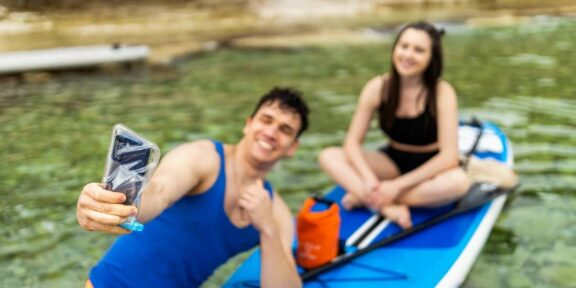Váš telefon tak bude perfektně chráněn a navíc nepřijdete o žádnou jeho funkci. Přes průhledný materiál můžete telefon pohodlně ovládat a protože se na povrchu pouzdra nedrží kapky vody, tak i fotit. Díky integrovaným vzduchovým kapsám pouzdro vždy plave, takže pokud ho třeba upustíte do vody, tak vám telefon nezmizí do hlubin. Navíc je pouzdrovo vybaveno praktickým poutkem, abyste si jej mohli kamkoliv připevnit. Certifikát IPX8 zaručuje vodotěsnost do hloubky 5 metrů, což by mělo pro běžné využití bohatě stačit a dokonce se nemusíte s telefon bát vyrazit šnorchlovat.