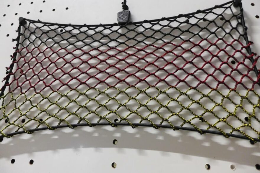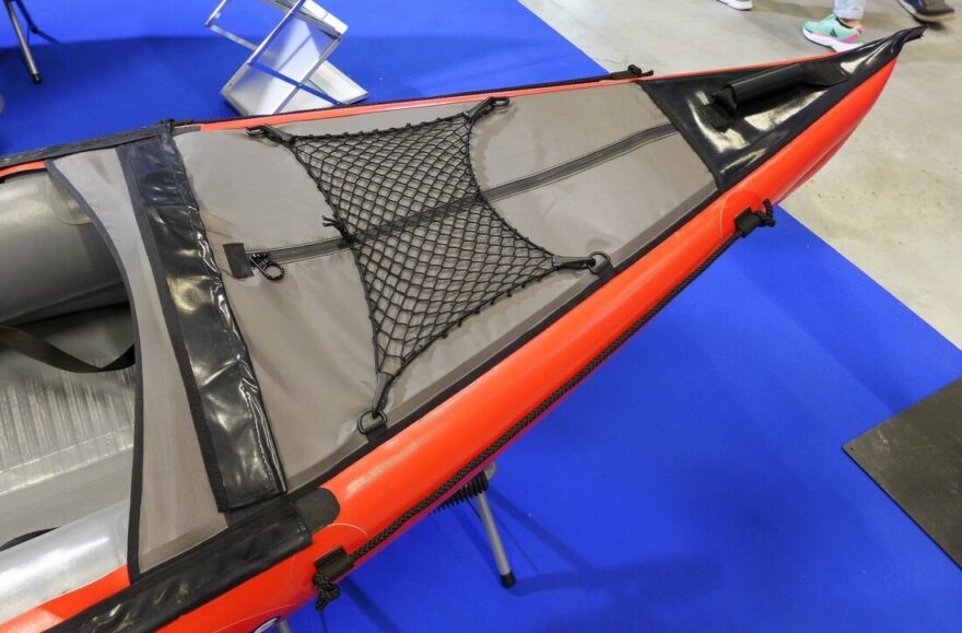 Hned vedle Profiplastu stál další český stánek a sice K-Gear Petra Kolomého. Petr vystavoval svůj klasický sortiment a z nových věcí mi představil dvě drobnosti. Zaprvé různobarevné cargo síťky určené zejména na paluby lodí (na fotce je síťka v barvách německé vlajky) a za druhé plastový držák na tyto síťky, které se díky němu mohou umístit třeba pod sedačku kánoe a lze do nich uložit věci, jež nechceme zbytečně válet na dně lodi – házecí pytlík, nápoje a podobně.