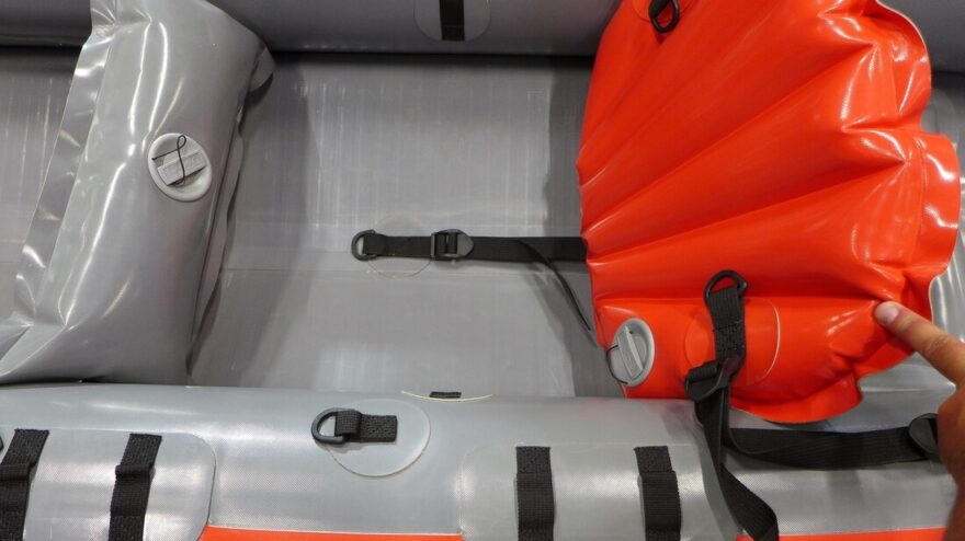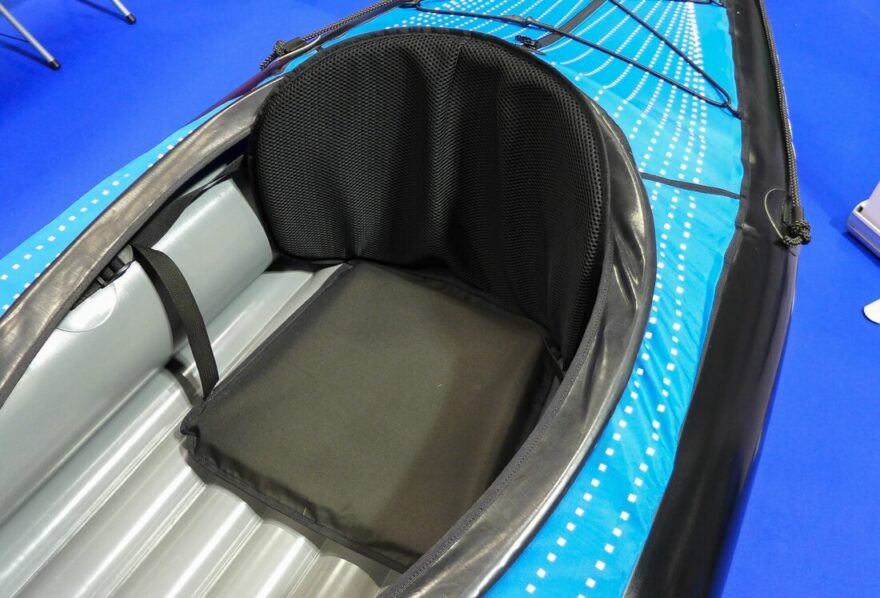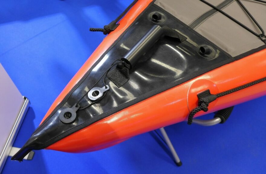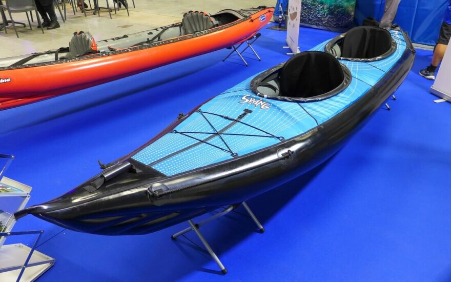 Dále okukuji dvoumístnou verzi kajaku Swing, který sice není nový, ale dočkal se, jak by se řeklo v automobilovém průmyslu, významného faceliftu. Na první pohled zaujme design paluby, která nyní září modrou barvou doplněnou o bílé prvky po celé ploše. K tomu se boční válce i dno obarvily na černo (oproti stávající červené nebo světle zelené v kombinaci se šedou), což vizuální atraktivitě také velmi prospělo. Zipy skrz palubu se změnily z vodě odolných na vodotěsné a v přední i zádní části lodě přibyla boční lana. Nově řešená jsou i madla, který jsou stejná jako u výše popsaného kajaku Seashine. I zde už můžeme vidět nový vylévací otvor krytý gumovým špuntíkem. Další inovace jsou uvnitř lodi. Ventily se přesunuly ze zadní části lodi do středu, což by mělo být strategičtější umístění zejména z hlediska vyfukování – kajak od špiček ke středu srolujete a pohodlně z něj vymáčknete co možná nejvíce vzduchu. Opěrky nohou už nejsou uchyceny jednobodově (na středu opěrky), ale dvoubodově, tedy stejně, jako jsme už viděli u Seashine.