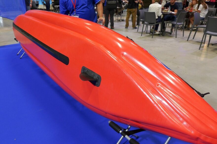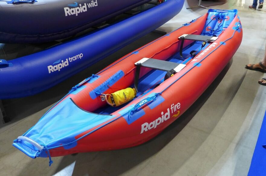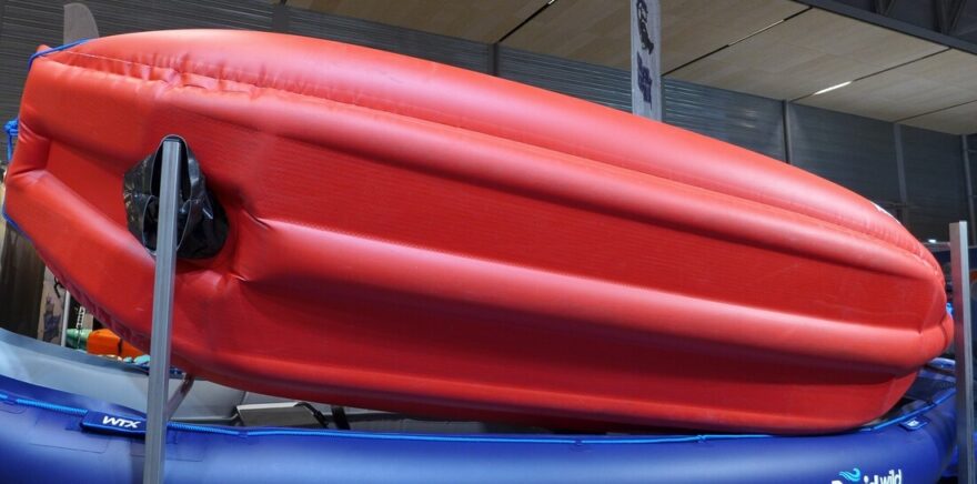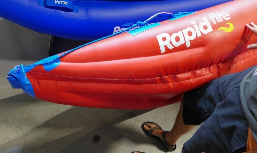 Ale tím hlavním, co tu Jirka Šťastný předváděl, byl prototyp malé nafukovací kánoe nazvané Rapid Fire. Ta byla designována s cílem vytvořit krátkou, rychlou a obratnou kánoi, která bude vhodná na menší české řeky a na závody typu ČPV a částečnou inspirací pro ni prý byla pevná krátká zavřená deblovka Noah Amerika. U Rapida Fire na první pohled zaujme dno, které je kombinované z klasických nafukovacích válců a z prvků drop-stitch. Výsledkem je ploché dno, které má uprostřed a po stranách vystouplé kýly. Zajímavostí ještě je, že svrchní část dna, tedy ta uvnitř lodi, je kvůli odlehčení z tenčího materiálu než vnější dno, které je naopak potřeba mít odolné. Dalším unikátním prvkem jsou boční válce vyrobené z jednoho kusu materiálu, což tvoří malou hmotnostní úsporu, ale hlavně se tím eliminoval, u nafukovacích lodí tradiční, slep na vrchní straně válce. Dále se výrobci povedlo udělat prohnutou spojnici válců v přední špici. Samozřejmostí u WTX je posuv sedaček po kedrech a další inovativní prvky, které se objevily a osvědčily už u Rapidů Wild a Tramp. Rapid Fire by se měl začít prodávat na jaře 2024. Jeho recenzi už mám domluvenou.