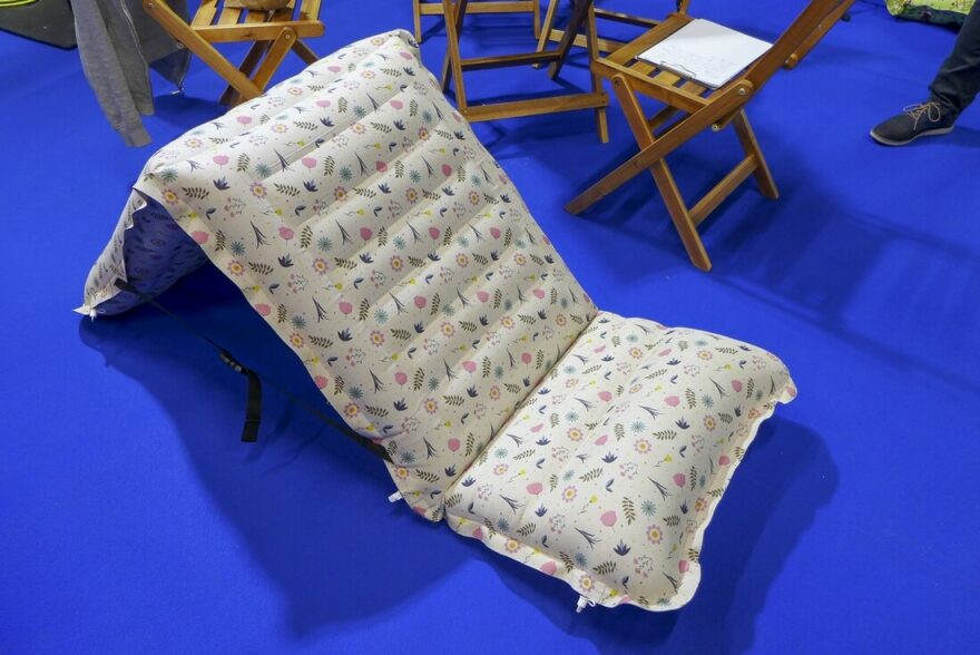 Třetí novinkou na stánku Gumotexu bylo nafukovací lehátko, jak správně podotkl Martin, jeden z mých průvodců, „reinkarnace lehátka“, které si nejspíš bude pamatovat řada čtenářů ze svého dětství nebo mladých let. Ano, ono staré dobré těžké nafukovací lehátko, které s sebou v jisté době tahal k vodě snad úplně každý, se dočkalo znovuzrození a bude zase k dostání. Samozřejmě ale lehčí a s nějakým tím vylepšením. O něco lepší než kdysi jsou ventily. V nabídce budou atraktivní designy a hlavní vychytávkou jsou ploché popruhy s nastavitelnou délkou připevněné k bokům lehátka, jež dovolují udělat z matrace pohodlné sedátko na několik způsobů. Nezbývalo mi, než si nechat natočit ještě jedno pivo a chvíli si to pohodlí užít na vlastní kůži.
