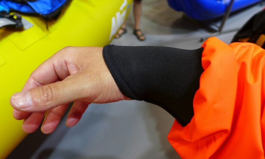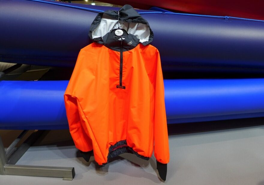 Z dílny VODÁK sportu mi byly předvedeny nové turistické bundy v trojici možných provedení – dlouhý rukáv, dlouhý rukáv s kapucí (kterou je možno schovat do límce bundy) a krátký rukáv. Bundy jsou jednoduchého střihu a mají pouze jeden šev vedený přes bok, podpaží a spodní stranu ruky. Zajímavé jsou neoprenové manžety na rukách, které mají nepravidelný tvar a jsou navržené tak, aby kromě zapěstí kryly i část záprstí, což bude zejména v chladných dnech hodně praktické.