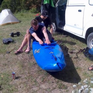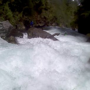 Řeka začala celkem kontinuálními čtyřkovými peřejemi, na kterých jsme se rozehřáli. Zanedlouho už nás čekalo nejtěžší místo, asi třímetrový drop odtékající do peřeje s velkým spádem. Dva z Němců vyrazili do peřeje první. My si prohlédli lajnu a já šla na řadu. Byla jsem celkem nervózní a chtěla jsem před dropem chytit vracák. Ale nájezd byl tak rychlý, že jsem to ani nestačila. Boofla jsem moc brzy, naštěstí jsem měla dost rychlosti, a tak jsem vybublala hned za skokem. Další boof v následující peřeji se mi už povedl načasovat dobře. Zbytek skupinky dojel v pořádku a následovala další kontinuální čtyřková pasáž. Na jejím konci jsme doslova vrazili do Joovy lodě, která byla naplácnutá na kameni. Kluci chytili vracáky a lezli na břeh, aby loď vyprostili. Já sjela o kus níže.