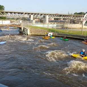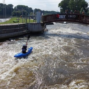 Nad skluzem na začátku kanálu se krátce po srazu u hlavní tribuny začínají hemžit první startující. Závod byl odstartován prvním kolem sprintu a mezi přihlížející už se řítí kategorie mužů, následována singlíři, juniory a holkami. Ihned po dojetí prvního kola se vrací všichni zpět na start a pokračujeme druhým kolem této rychlostní disciplíny. Oba časy, za první i druhé kolo, se sčítají a určují pořadí sprintu. Nejrychleji se v součtu za obě kola prodral Honza Kolář, následovaný Pepem z Pluta a Pavlem Srbeckým. Nejrychlejším juniorem byl Adam Kašpar, který si dal ale kola v podstatě čtyři, protože se pokusil o slušné umístění i mezi velkými chlápky a docela se mu to podařilo. Následován Matějem Janouškem a Vítem Suchomelem si odnesl za sprint plný počet bodů do celkového hodnocení.