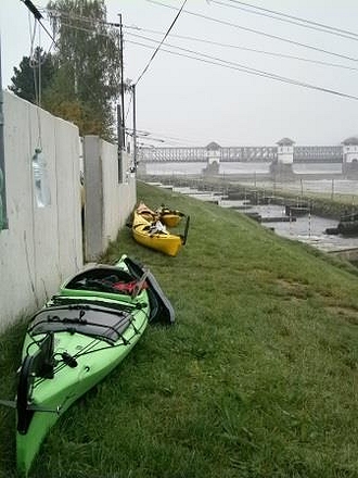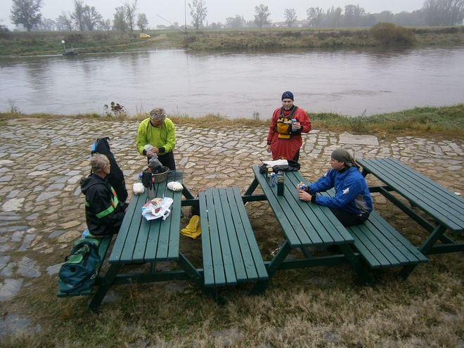 Ráno jsme měli sraz sice v Tróji, ale lodě (trochu větších rozměrů, než jsme zvyklí) jsme naložili na auta a popojeli do Veltrus. Tam tekla voda „sportovní propustí“ a přemýšleli jsme o krosové variantě mořského kajakářství, ale než jsme se rozhoupali, koryto kanálu bylo suché a místní brigádníci sháněli kýble na ryby, které lovili rukama. Pánové jeli přesunout vozidla a já byla ponechána svému osudu v ranní mlze. Dostala jsem za úkol naložit proviant. Vzhledem k tomu, že byl zabalen v docela velkém loďáku, připadala v úvahu jediná loď, která měla dostatečně velký otvor. Vlastně ty lodě byly dvě. Jedna z nich byla moje. Tak já si vzala gril.