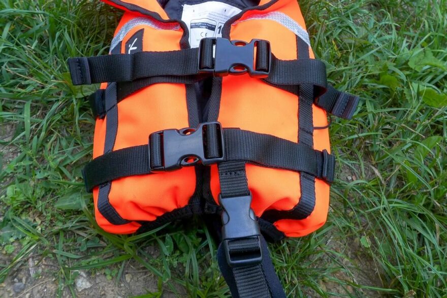 Zapínání vesty je řešeno dvěma plochými popruhy vedenými vodorovně kolem těla, které se na přední straně zapínají na plastové spony a lze je po obou stranách dotáhnout. Samozřejmostí jsou také gumová očka, kterými přebývající popruhy zajistíme proti plandání. Zapnutí i dotažení popruhů je velmi snadné, což jsem, vzhledem k počáteční neochotě dcery se do vesty oblékat, velmi ocenil. Další popruh je svislý a vede dítěti mezi nohami (kde je polstrovaný neoprenen), čímž zabraňuje možnému vypadnutí z vesty spodem. Tento popruh se zapíná rovněž na plastovou sponu, která je umístěna pod spodnějším vodorovným popruhem, ke kterému je i připevněna. Na zadní straně vesty svislý popruh pokračuje až k vrchní části límce, kde je zakončen madlem pro nouzové uchopení či vytažení dítěte z vody. V zádové části je popruh přišitý k vestě, aby nevznikala zbytečná oka, do kterých se mohou chytit třeba větve.