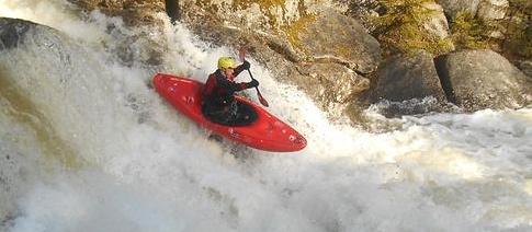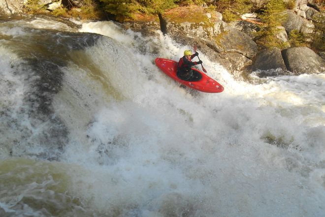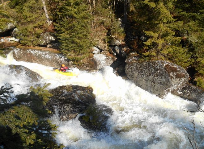 První vlny a skoky zvládáme celkem v pohodě a dostáváme se k hlavní pasáži v zatáčce. Ta začíná rozdvojením řeky, kde hlavní proud jde doleva a mizí v zablokovaných stupních, následuje vracáček a za ním krásný slide zakončený skokem. Ve vzduchu se vznáší vodní tříšť, řeka má obrovský spád a v první chvíli o sjezdu ani nepřemýšlím. Nakonec zde volíme dámskou cestu pravým ramenem.