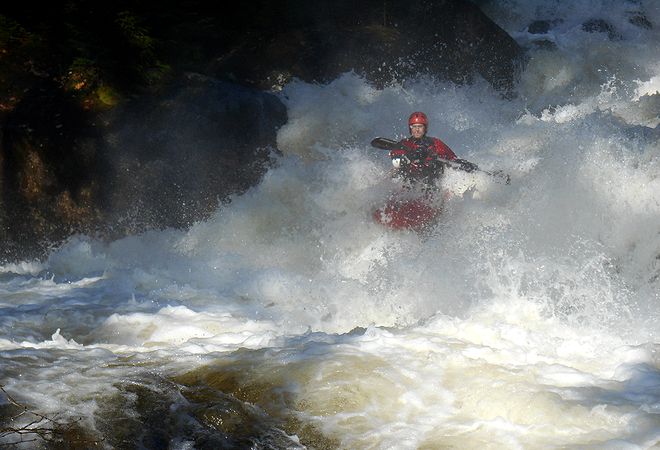 Pod slidem vydýcháváme před druhou částí peřeje, která začíná obávaným „šoufkem“, který mi připomíná škvíru. Když vidím průjezdy (proplavání) některých pádlerů, docela mi zatrne, zvláště potom, co jeden nechá v nájezdu pádlo a pokračuje dále bez něj. Jak to vypadá, když jedete pětkovou peřej bez pádla si asi všichni dokážete představit, ale má nakonec celkem kliku a dostává se i s lodí ke břehu nad třímetrovým skokem, který by byl v lodi takovým bonbónkem na závěr.