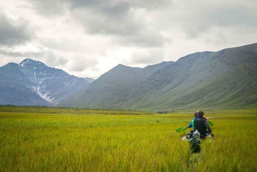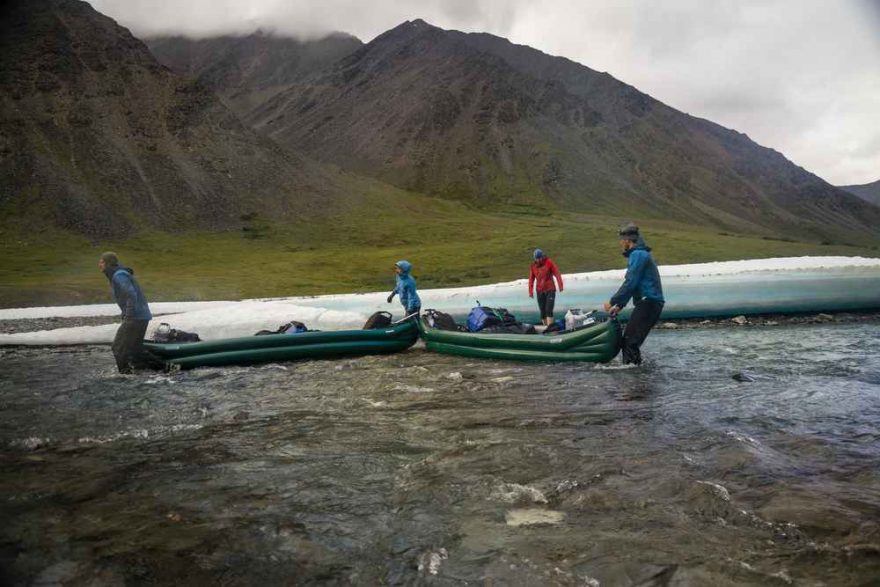 Díky přítokům vody v řece postupně přibývalo, a my jsme tak mohli střídavě i plout. Za přítokem Weyhok Creek jsme se ocitli v údolí, kde se zima nevzdává ani během krátkého polárního léta. Vedle řeky totiž ležela obrovská hromada sněhu. To už jsme ale vyhlíželi místo na tábořiště.
