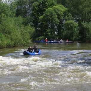 Celý úsek je zase bez jezů! Z toho jsme úplně vedle. Pravda, jeden kamenný stupeň, který byl za naší vody (po načtení stopy ze břehu) dobře sjízdný, jsme potkali, ale je to spíš taková větší peřej než opravdický jez. Jinak meandry, mělčiny, peřejky a řeka v přírodě. Pod Krňovicemi visí na zpestření i pár slalomových branek, kde můžete zjistit, jak dobře to s kánoí umíte. My jsme šťouchli tak půlku…