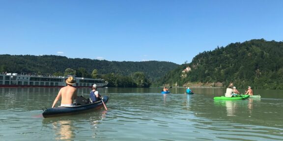 Zabalit, odpendlovat a vydat se na cestu. Před půl dvanáctou jsme na vodě, řeka zas příjemně teče. Pravá, rakouská strana každý druhý kilometr odhalí malou osadu s přístavním molem, kde ale žádná z velkých lodí nepřistává. Levá strana je na obyvatelstvo chudší, my zastavujeme po 7 kilometrech na břehu u města Niederranna, kde je pěkné místo k vystoupení, že se ani můj spící háček při manipulaci s lodí nevzbudí. Už jen přejetí řeky, které vzhledem k její šířce dobré dvě minuty zabere. Celou dobu jedeme při pravém břehu, ale vidina poloviny cesty nám před mostem velí přejet k levému břehu na zmrzlinu. Někteří se raději přiobléknou, i tak ale vzbuzujeme tázavé pohledy místních popíjejících kávu na zahrádce.