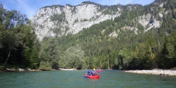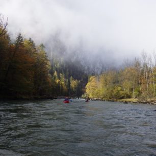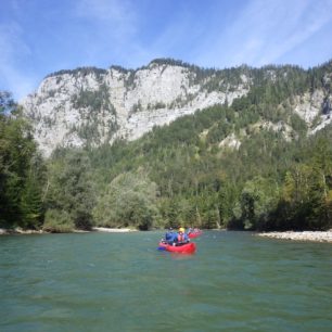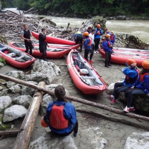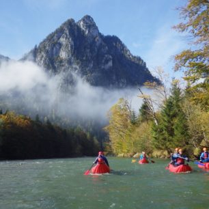 Jsme už zpátky u lodí, dáváme si svačinu a něco teplého na zahřátí, vyplouváme. Řeka je svižná, ale ne nebezpečná, nějaké ty nenáročné peřeje a kameny jsou po předešlých dnech na Salze hračka. Škoda jen, že je pod mrakem. Údolí se tady pěkně otevírá a za slunečného počasí jsou krásné výhledy na hřebeny a vrcholky Alp, vděčné místo pro luxusní fotky.