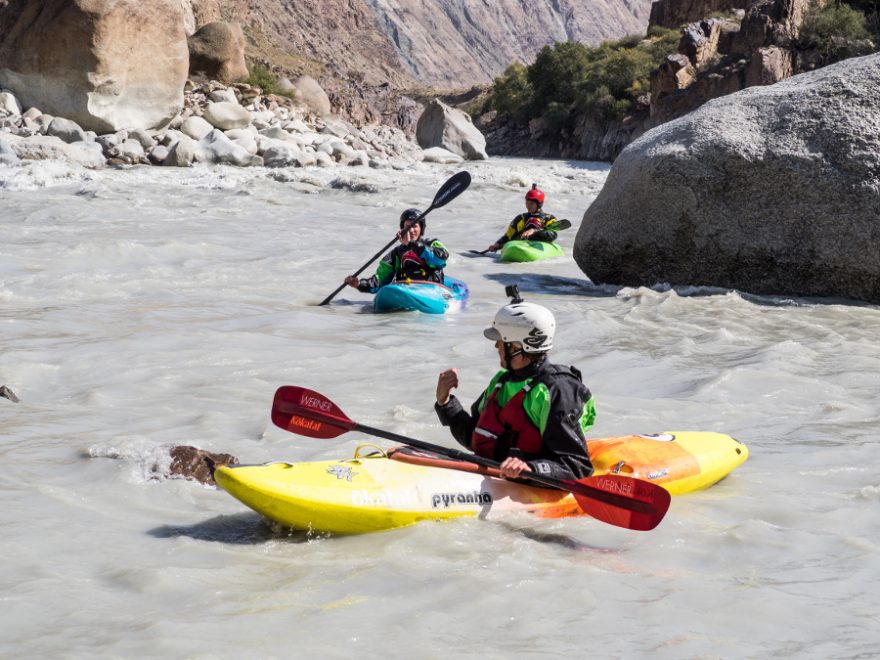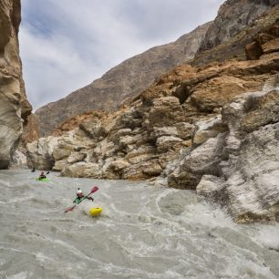 Ráno se probouzíme a hned vidíme, že řeka zase o něco nastoupala. Voda se valí přímo na střed přes kameny do velkého válce, který se bude těžko objíždět. Nakonec až na Sama a Ariho volíme lehčí variantu mezi kameny ostře vpravo. Dokonce i spodní část pod hlavním válcem se ukazuje být dost výživná a ve vracáku se scházíme dost udýchaní. Sary Jaz nabral na síle a je zřejmé, že zadarmo to nebude.