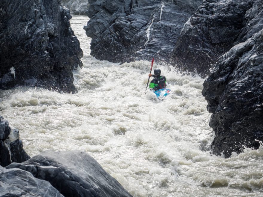 Nad další peřeje posíláme dron. Vše vypadá jako zábavná WW III. Hned první vlny nás ale vyvádějí z omylu a my valíme pořádnou bigwater WW IV. Naštěstí se řeka po celém dni začíná zklidňovat a my vyhlížíme naši „únikovou cestu“ – Kayakup Creek.