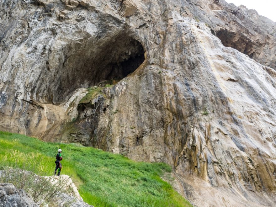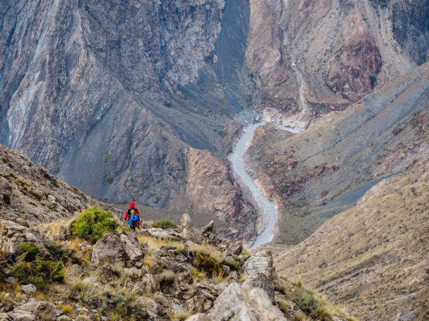 Asi po hodině začíná mírně sněžit, ale naštěstí není mlha a funguje navigace. Všichni se scházíme v malé kamenité průrvě a vytahujeme suché obleky. Je zima, mokro a hlína pod nohama se mění na klouzavé blátíčko. Čeká nás ještě několik lezeckých sekcí skoro tisíc metrů nad řekou. Začínáme závodit s časem. Chceme se vrátit k věcem u meteorologické stanice, než se setmí, což se nám nakonec, po velice strmém sestupu a sedmi hodinách lezení, daří. Přes Sary Jaz se dostáváme po staré sovětské lanovce už za tmy.