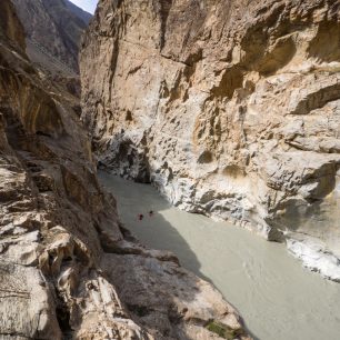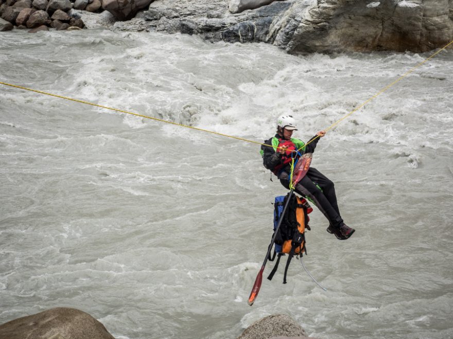 Po třech hodinách pochodu se dostáváme k našemu lanu přes Sary Jaz. Jeden po druhém se včetně všeho vybavení vydáváme přes mohutnou masu vody. Lano se čím dál více prověšuje a poslední z nás jsou jen centimetry nad vodou.