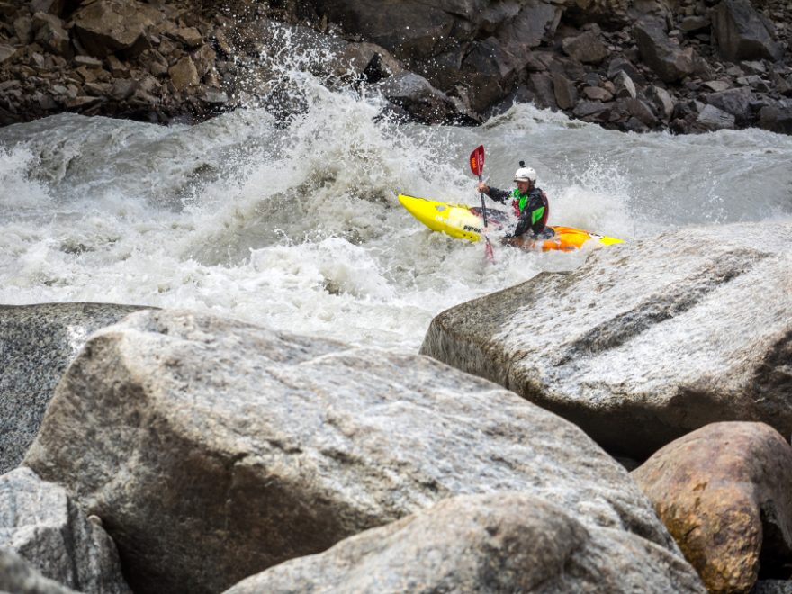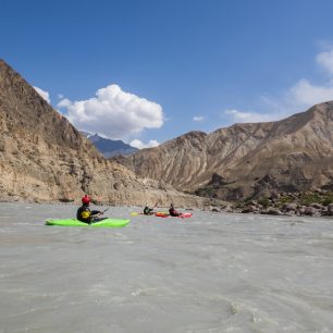 Postupně se probíjíme skrze peřeje a pořád si ještě zvykáme na těžké lodě. Máme naloženo jídlo a vybavení na dvanáct dní včetně věcí na lezení a oblečení na teploty pod nulou (pohybujeme se ve výšce nad 2 000 m). Snažíme se být připraveni na všechno.